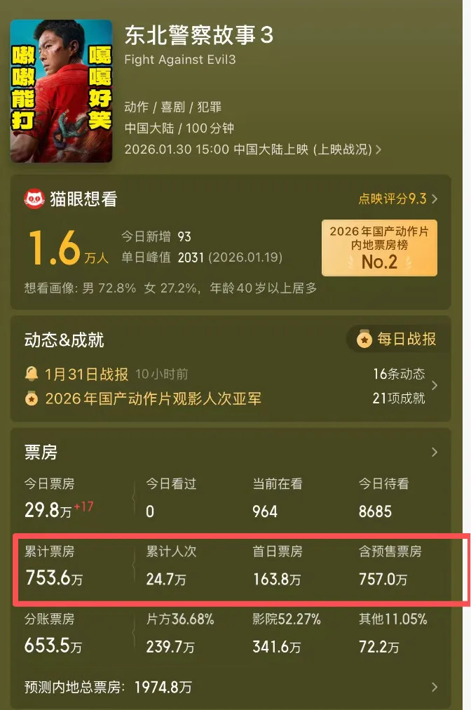 首日5%的排片都撑不起,开始倒挂,到了现在上映了3天,就连续倒挂了三天。截止到发稿时间,《东北警察故事3》的票房只有754万,比不上40年前的经典片子《闪灵》,竟然也打不过都上映了2个月的《疯狂动物城2》。